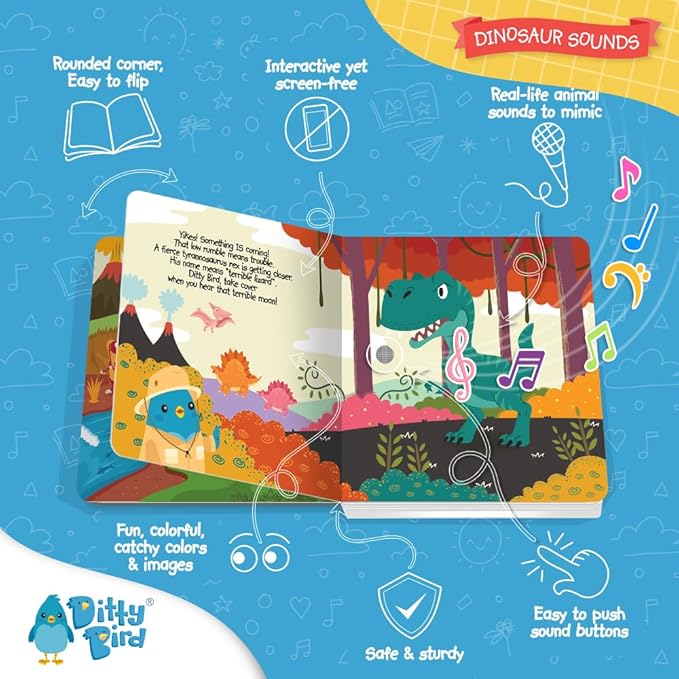 Ditty Bird Dinosaur Book for Toddlers | Realistic Dino Sound Book | Interactive T-Rex Board Books for Toddlers 1-3 | Sensory, Musical Books for Dino Lovers | Sturdy Nursery Rhyme Toys for Baby