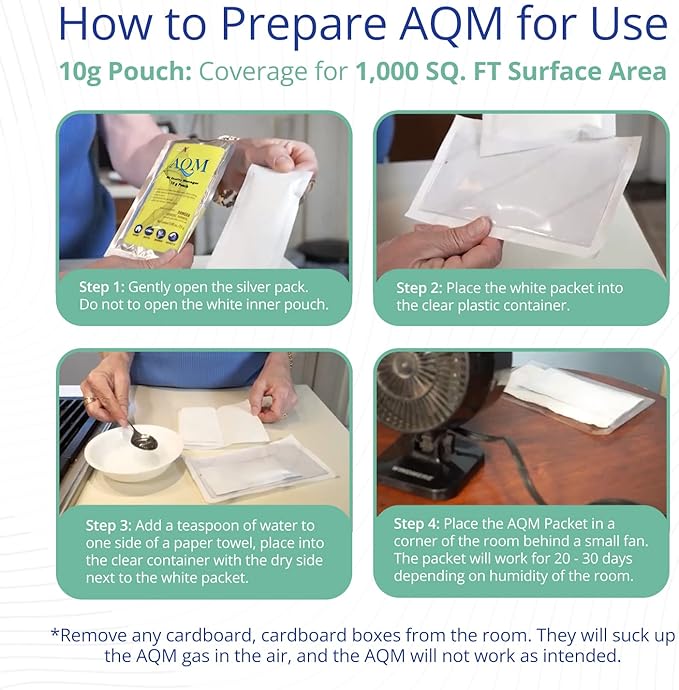 - How to Use: Place the AQM Packet in a corner of the room and open the silver packet; Remove the white pouch and place it back into the clear, self-adhesive protector; Place a slightly moistened paper towel in the protector, then place the protector pack behind a small 4β³ diameter fan; The room will be completely deodorized and the packet can produce the gas up to 20-30 days; Depending on the odor, the smell could be gone for years