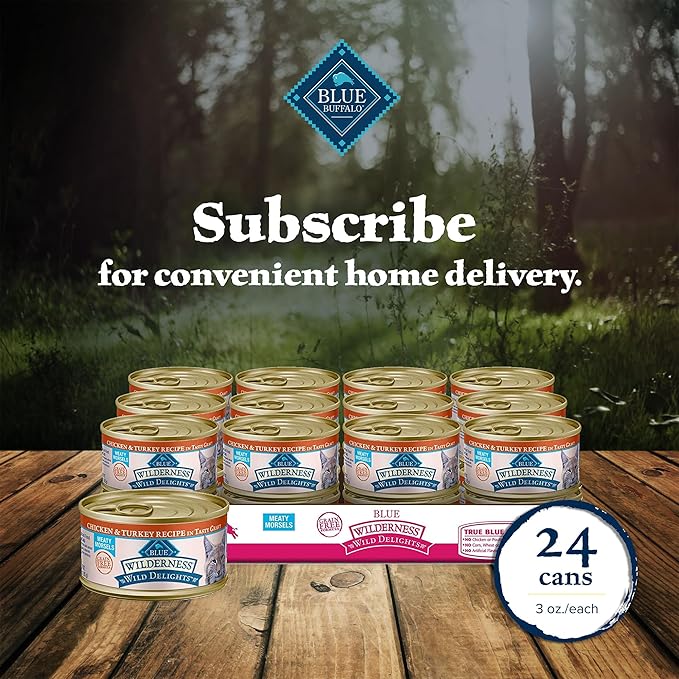- Contains: Twenty-four (24) 3-oz cans of BLUE Wilderness Wild Delights Meaty Morsels Wet Cat Food, Chicken & Turkey Flavor