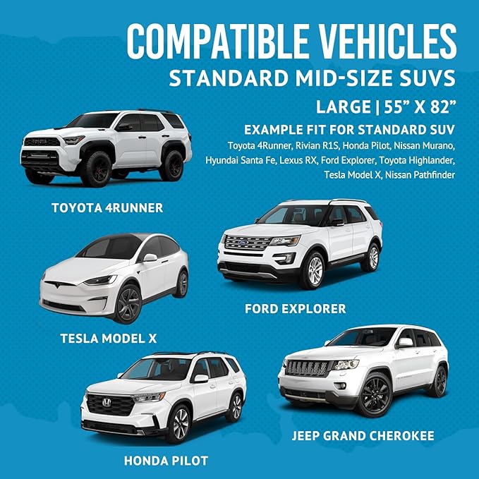 - Versatile Fit: Universal fit and unique design cargo & trunk liner measuring at ( 55" x 82" ) inches. DOES NOT EXTEND FULLY UP TO THE WINDOWSβSEE IMAGES AND MEASUREMENTS FOR ACCURATE COVERAGE DETAILS. Bulldogology designed pet cargo seat covers for Suv and other vehicles to install and remove in under 30 seconds. Secure the covers with easy to use durable headrest adjustable straps, keep covers in place with moisture protection non-slip silicon backing. Each feature was manufactured for ease of use and added versatility.