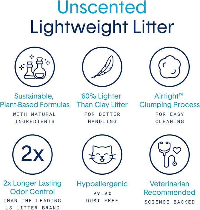 - EASY TO POUR & EASY TO CLEAN: 60% lighter than clay litters, making it easy to lift, pour and store. Clumps form instantly on the top of the litter box, rather than sticking to the sides or bottom. Non-stick for easy scooping & cleaning throughout the month.