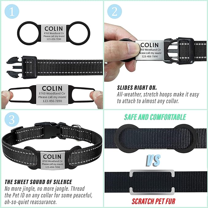 - πΆ Silent, Durable, And Lightweight Dog Tags: Made from rustproof stainless steel & silicone, our pet tags for dogs and cats will stand the test of time. The easy, slide-on design makes our pet ID tag silent and ideal for puppies and kittens.