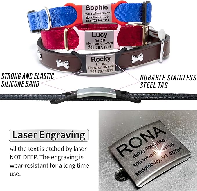 - π Laser Engraved Pet ID Tags: Rest assured, the laser engraved, clear text on your personalized dog collar tag or personalized cat collar tag will look great and will not fade. Attach your engraved pet tag to your pet's collar or harness.