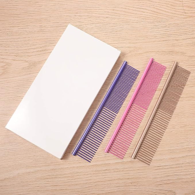 - 2 Different densities: the steel teeth of these dog combs have two different densities, the dense part can be applied to combing the soft hair near the eyes, ears and legs, and the sparse part can open the tangled hair for a fluffy hair; In addition, the ends of the stainless steel teeth are polished and rounded, which will not harm the pet's skin