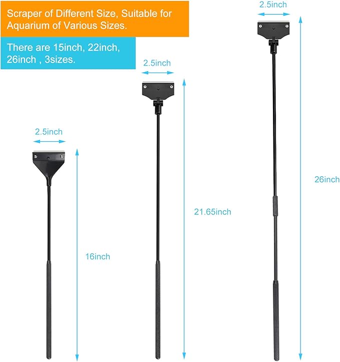 - Multiple specifications are available-- We provide three different lengths of algae scrapers, 16, 21, 26 Inches, you can choose the appropriate length according to the height of the fish tank.