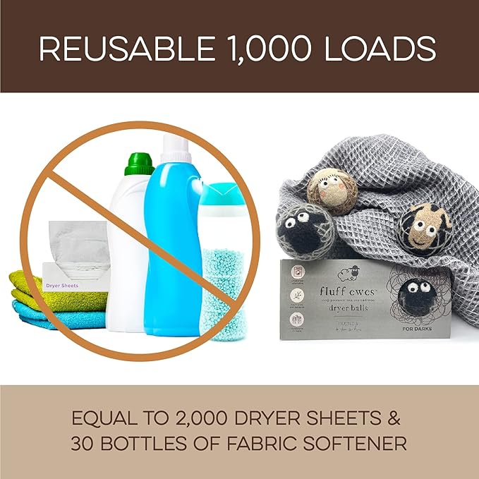 - REUSABLE FOR 1000+ LOADS β REDUCE WASTE: Why keep buying disposable dryer sheets? These cute dryer balls last 1000+ loads, replacing 2000 dryer sheets or 30 bottles of fabric softener. Fluff Ewes dryer wool balls laundry reusable deliver a cost-effective solution for 2-4 years of hassle-free laundry. Make a smarter choice for your wallet and the environment.