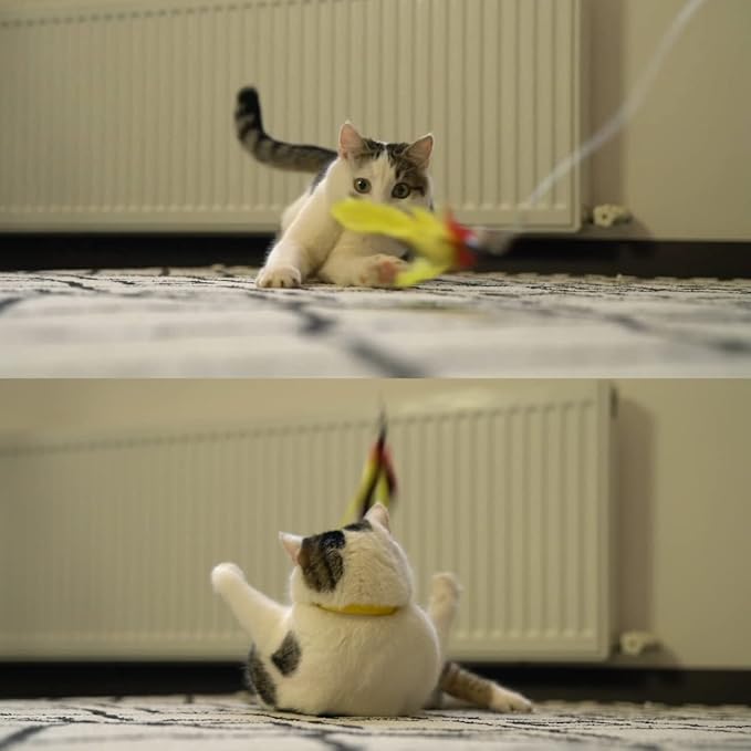 - 4. NATURAL FEATHERS: The feathers made from Safe, natural material. Please always supervise your cat when playing with this. Please put the toys in a safe place when not in use.