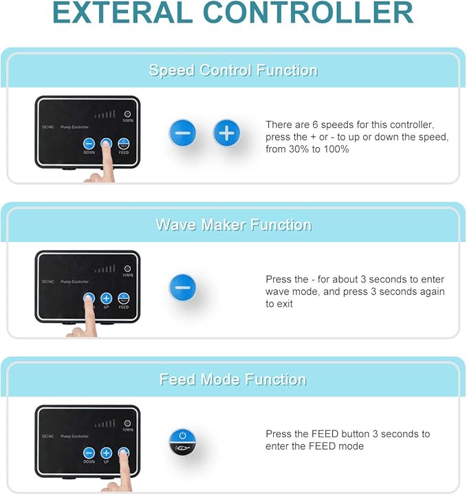 - DC controllable water pump:6 speed adjustable,control the flow from 30% to 100% of max flow,adjustable dc return pump for nano reef aquarium,with 10 minutes feeding mode and wave maker function;