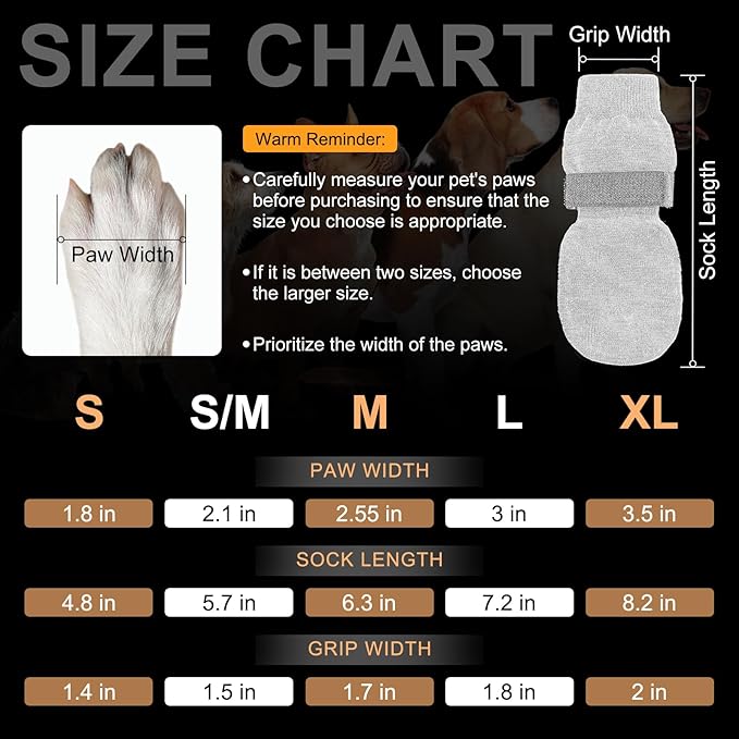 - Dog Socks Size Large: Grip Width 1.8",Paw Width 3", Length 7.2". Please measure your pet before purchase, if your size is between the two sizes, it's better to choose the smaller size. Because our pet paw protector socks are fabrics with elasticity. (Measurement method: let your dog step on a piece of paper and draw the outline of the paw. Measure the width of the claw and choose size. Note: make sure your dog is on paper instead of putting your paws on the paper at will.)
