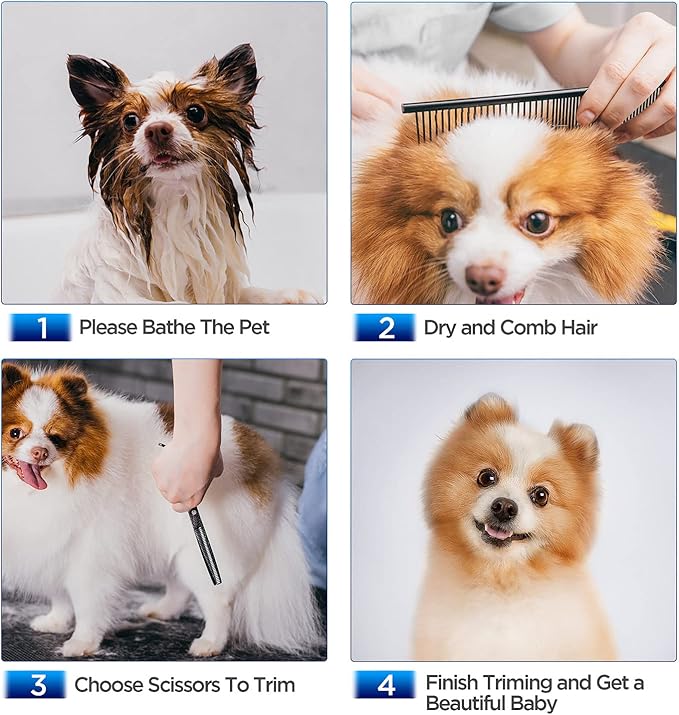 - 【5 in 1 Dog Grooming Scissors Set】The dog grooming scissors set comes with 1 straight scissors, 1 thinning scissor, 1 curved scissor, 1 grooming comb and 1 storage case