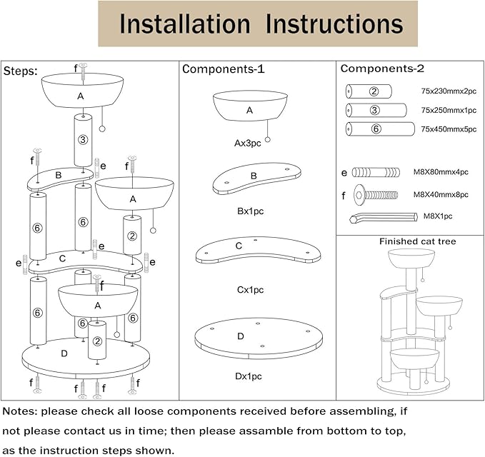 - Key points. Please correctly install and tighten according to the installation drawing. Incorrect installation will cause the cat climbing frame to shake slightly and cause the cat to fall when climbing. We are waiting for your feedback 24 hours a day, We are willing to help you in every possible way.
