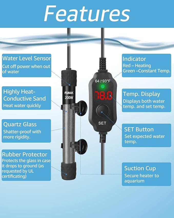 - SUPER ACCURATE 1℉ – Thanks to the intelligent inverter technology, with the in-built chips the thermostat keeps the fish heater at a constant temperature at an accuracy of 1℉, much more accurate than the traditional knob-controlled fish heaters and you save your electricity expenses by 50%!