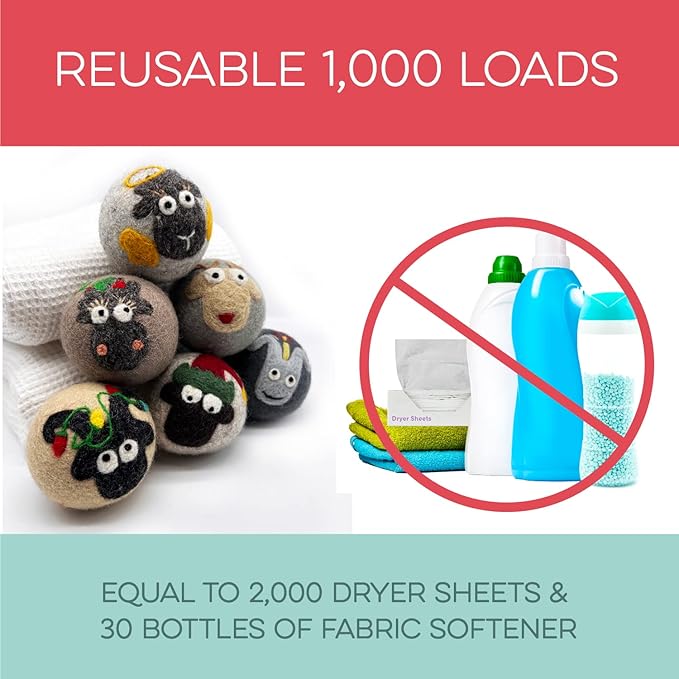 - REUSABLE FOR 1000+ LOADS β REDUCE WASTE: Why keep buying disposable dryer sheets? These cute dryer balls last 1000+ loads, replacing 2000 dryer sheets or 30 bottles of fabric softener. Fluff Ewes dryer wool balls laundry reusable deliver a cost-effective solution for 2-4 years of hassle-free laundry. Make a smarter choice for your wallet and the environment.