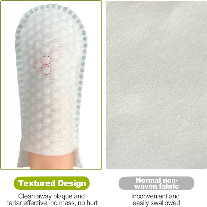 - Embossed Texture Design: The teeth wipes are made of non-woven fabrics, which have a softer embossed texture and wonβt damage Oral Soft Tissue. On the one hand, the embossed texture can increases the friction of the product to make physical scrub to clean teeth more powerfully. On the other hand, it can effectively clean the stubborn stains between the teeth, and improve the oral hygiene of pets.