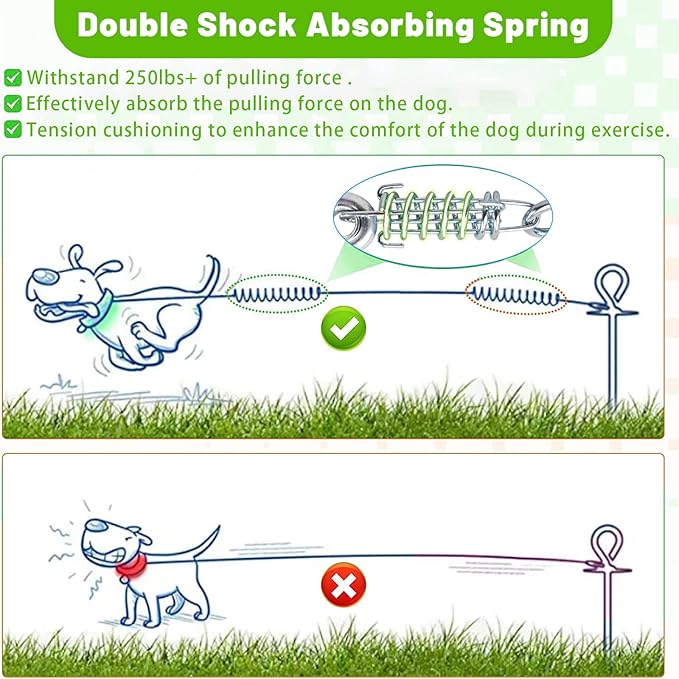 - DOUBLE BUFFER SPRINGS: Buffer springs are provided at both ends of the rope to maximize the protection of dogs. It can buffer the pulling force produced by the dog when running fast, reduce the damage to the dog's neck and body, and give the dog a more comfortable playing environment. provide a more comfortable playing environment for the dog.