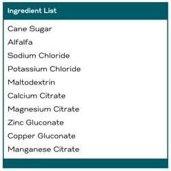 - HIGH-PERFORMANCE EQUINE NUTRITION: Not intended to serve as free-choice or as a replacement for your horse's drinking water. Ingredients: Cane Sugar, Alfalfa, Sodium Chloride, Potassium Chloride, Maltodextrin, Calcium Citrate, Magnesium Citrate, Zinc Gluconate, Copper Gluconate, Manganese Citrate