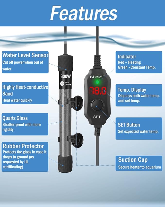 - DRY RUN / OVERHEATING PROTECTION – Full consideration of safety. With the multiple protections this fish tank heater will stop working when the water level is lower than the minimum water level (DRY RUN PROTECTION) or when the water temperature exceeds 97F (OVERHEATING PROTECTION). You are free from “cooking fish”!