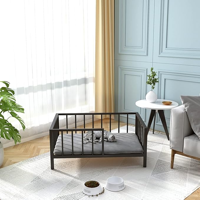Dog Bed with Rails - Elevated Pet Metal Bed Frame with Solid Wood Board and Washable Soft Mat for Medium Dog Indoor or Outdoor Use, 25.2" x 37.8", Black