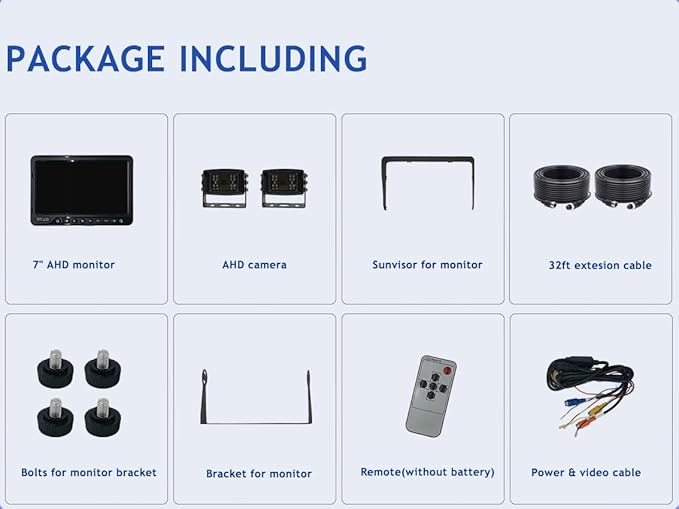 - [APPLICATIONS]This is an upgraded industrial grade WIRED two-camera system. For its high vibration resistance ability of 10G and wide power input range DC12-36V, it is suitable for large vehicles, such as buses, box trucks, pickup trucks, garbage trucks, flatbed trucks, dump trucks, street sweeper trucks, refrigerator trucks, motor homes, vans, skid steers, farm tractors, combines, cotton pickers, crop sprayers, bulldozers, snow plows, forklifts, excavators, heavy equipment, etc.