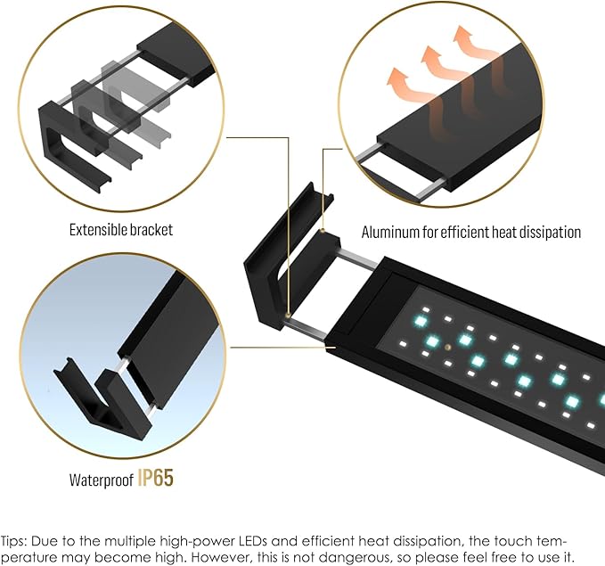 - 【Smart APP Control】This smart aquarium light with WiFi+Bluetooth dual control, which can maintain the operability of the device even in the WIFI offline state. With this smart APP, you can easily manage and adjust your fish tank light's settings at anytime and anywhere.