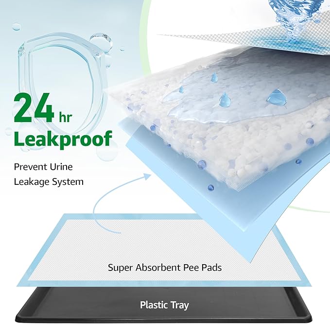 - 5 DISPOSABLE PEE PADS: The dog potty system come with an incredible dog pee pad solution. Advanced absorption technology from Japan,when the drainage holes get the liquids to travel downwards, Oiyeefo puppy pee pad catch the urine and absorb it quickly, so the extreme odor-causing issues can be easily curbed.