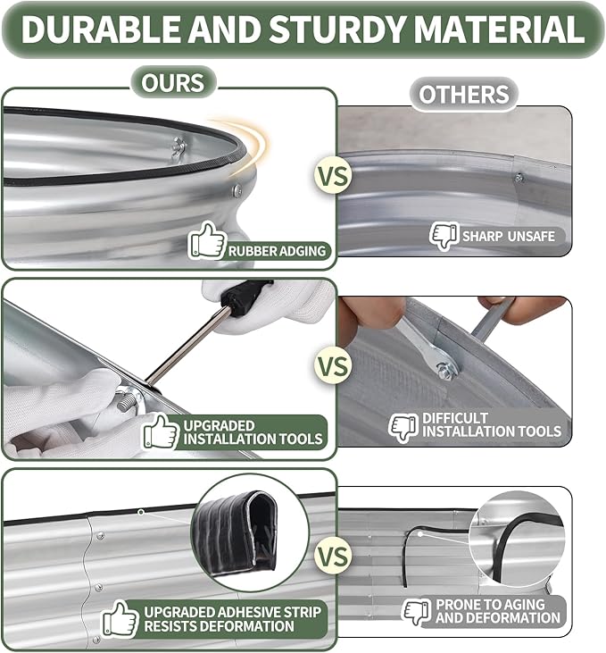- 【High-quality materials & Durable】 Our outdoor raised garden bed is made of 0.5mm galvanized metal sheet, with double-layer anti-corrosion galvanization and an oval-shaped design. It is resistant to corrosion and rust, providing a long-lasting gardening solution that can be reused for many years.