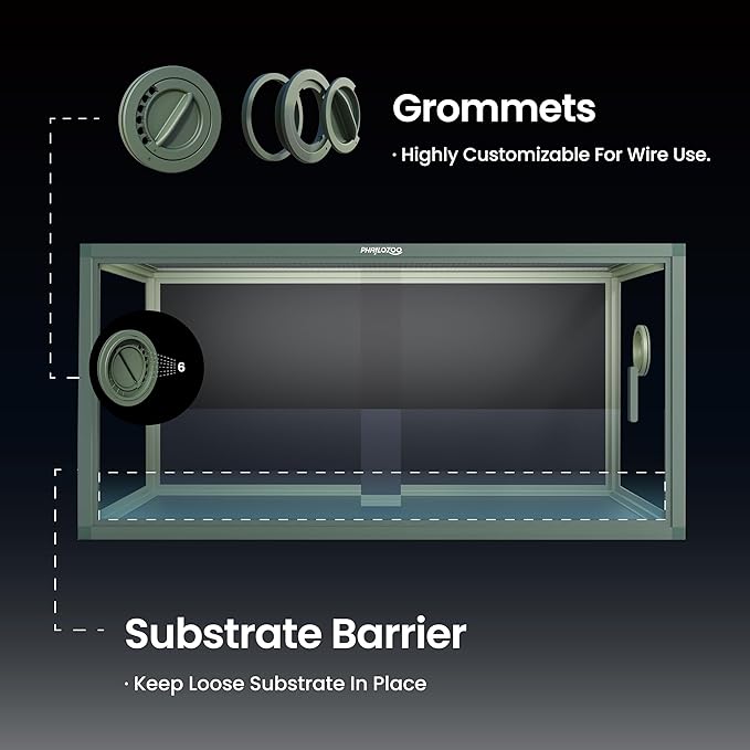 - 【Easy Maintenance】Front opening reptile terrarium with door handles included for easy cleaning & feeding. No more suction cup problems or unsightly fingerprints all over. The substrate barrier keeps the substrate in place. Our tempered glass doors are durable enough to withstand scratching.