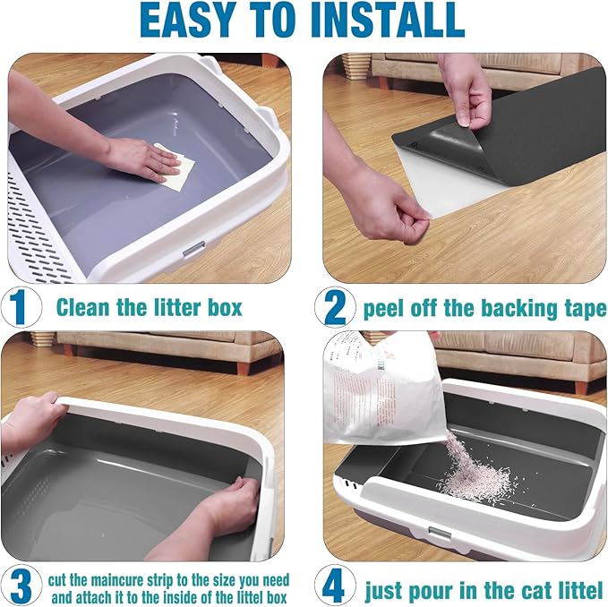 - 【Easy To Use】: You just need to peel and stick it to the cat litter box to use it! This nail file for cats have 3 pairs of different sizes: 2 strips measuring 14.5" x 5.9", 2 strips measuring 14.5" x 3.14'', 2 strips measuring 11.81'’×3.14'', the product is removable and waterproof, easy to clean and install. You can install it on flat, smooth and clean surfaces for best results! After 10 or more scratches, your cat's nails are ready to be filed down.
