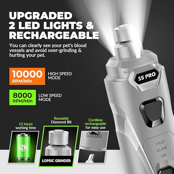 • 【Improved Precision: 2 LED Lights & Adjustable Speeds】: LOPSIC dog nail grinder for dogs features 2 LED lights that offer clear visibility of the quick, ensuring precise and safe nail trimming for your pets. The adjustable speeds(8,000 RPM to 10,000 RPM) of dog nail trimmers can adapt to small, medium and large pets nail trimming needs. When using the dog nail trimmers at the proper speed, pet nails of different hardness can be efficiently ground.