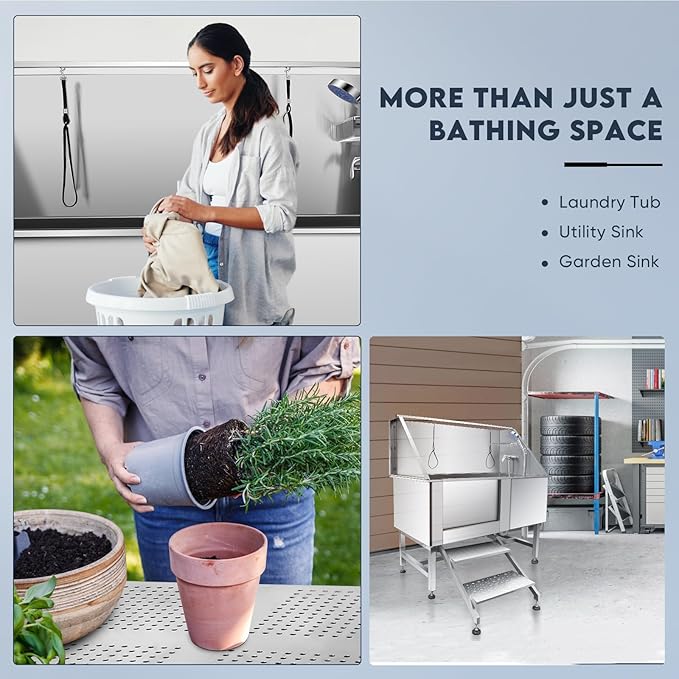 - 🐕 STURDY - The dog bath tub is made of 304 stainless steel that is high in quality. Heavy duty pet grooming sink is 62Lx28Wx42H as accommodating various sizes of dogs, especially dogs (max capacity-280lbs), and perform long-lasting use due to its high grade stainless steel material