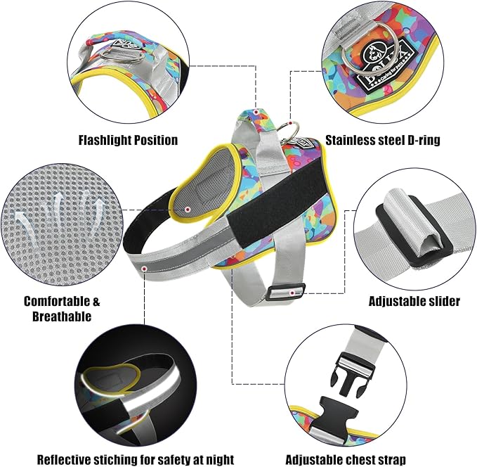 - SUPER COMFORTABLE: Bolux no choke dog harness pulling pressure is evenly distributed to the body to prevent pulling and choking. The dog vest harness have a adjustable chest strap with snap on buckle, move its body parts freely, can customized fits for your puppy growth do not need to always change it.