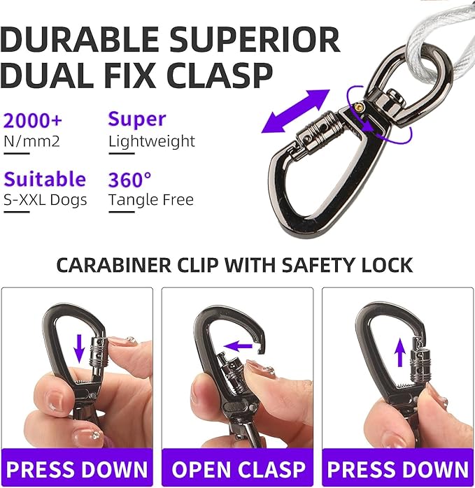 - Upgrade Heavy Duty Buckle & 360Β° Tangle Free-dog cable use heavy duty locking carabiner, stronger and more durable, with a 360Β° smooth rotation axis, your dog can run freely without getting tangled.