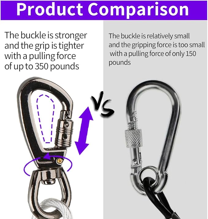 - Upgrade Heavy Duty Buckle & 360Β° Tangle Free-dog cable use heavy duty locking carabiner, stronger and more durable, with a 360Β° smooth rotation axis, your dog can run freely without getting tangled.