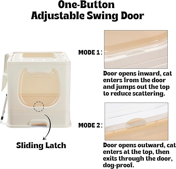 - Customizable Entry with Clear Swinging Door - The litter box features a buckle-controlled swinging door, allowing your cat to choose their preferred way to enter and exit based on their habits. The clear door makes it easy for us to observe the condition of the poop in the litter box for immediate cleaning.