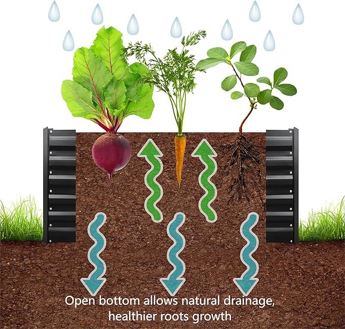 - OPEN BOTTOM: Sits on the ground garden bed, allows natural drainage, prevent waterlogging and root rot. It encourages the plantsβ roots to grow deep into the ground, promoting stronger and healthier plants.