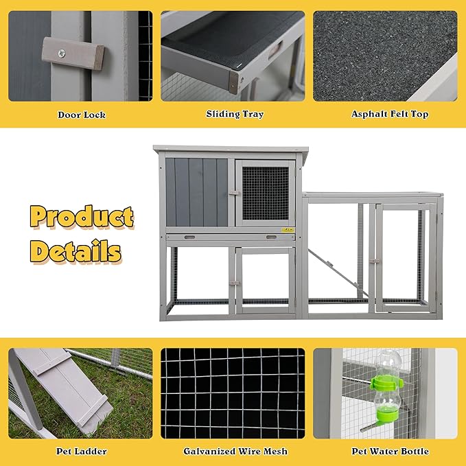 - [Easy to Clean]:The attic of rabbit hutch outdoor is equipped with a sliding tray contributing to provide a comfortable and sanitary environment. The smooth surface and high hardness plastic can be cleaned by rinsing with water only. An openable roof and two front doors for easily cleaning and feeding.
