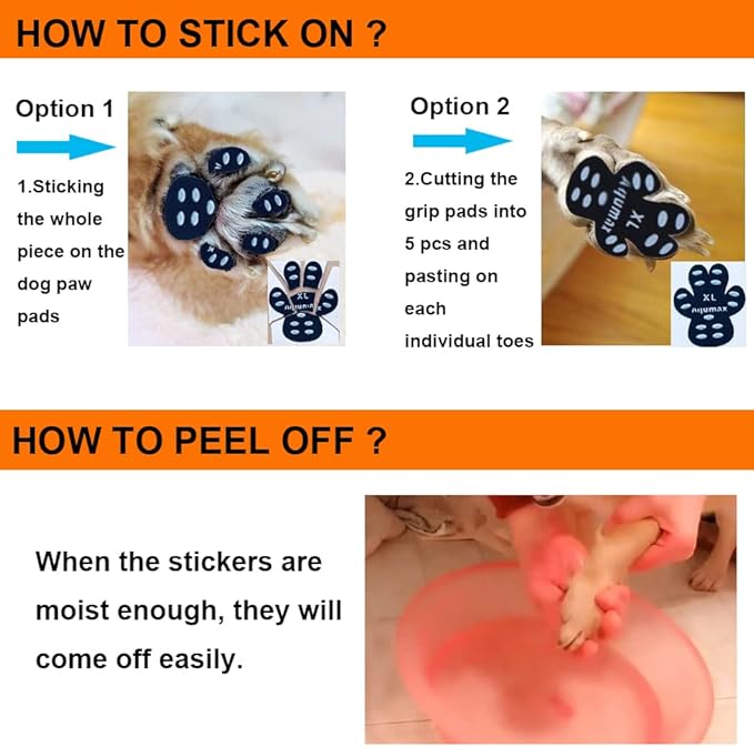 - 【Warm Tips】1) Both oil and water are the most important factors that make the product non-stick. So if your dog's feet are just coated with Emollient Oil, it will not stick when you paste the paw pads on; 2) If you dog's paw size is between 2 sizes,please buy the larger size.Then you have two ways to stick the traction pads on dog feet.