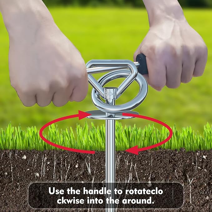- EASY TO INSTALL:the heavy-duty dog lashing pile is designed with auger bits and curved blades,so you only need to rotate it a few times easily.The sharp,curved double blades will slide effortlessly through the soil and drop it into any ground.The built-in soft handle stainless steel rod is easy to carry and can be easily screwed to the pile.