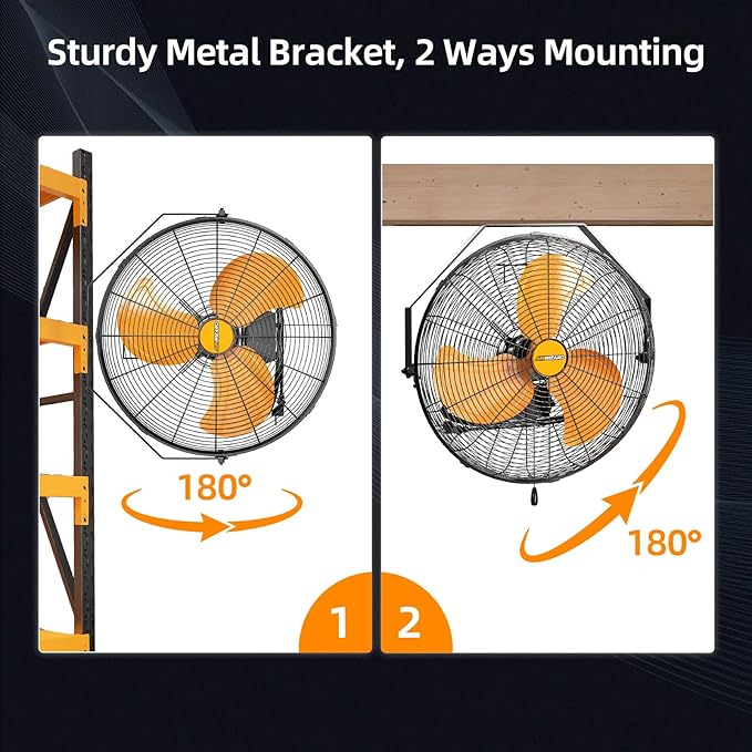 - 2 WAYS MOUNTING - You don't need to assembly the fan, using new bracket made out of power-coated steel construction hang the fan on the wall or the ceiling. This Industrial wall fan can tilt a full 180°, just switching the adjustment knob to direct air exactly where you need it.