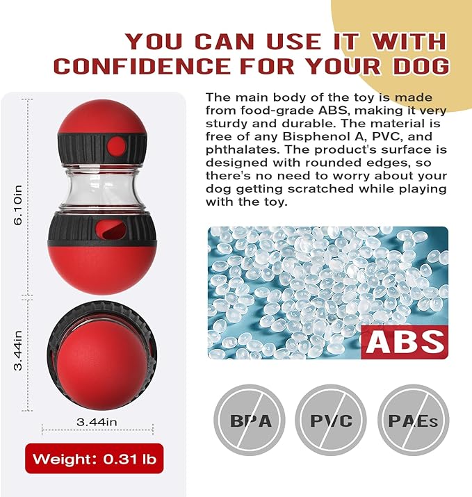 - [Treat Distribution] Our food dispenser has differently sized spheres at both ends. As dogs push the toy, it moves within a fixed area, allowing dogs to continuously chase and play with it. During movement, food is dispensed from the food holes on both sides of the toy.