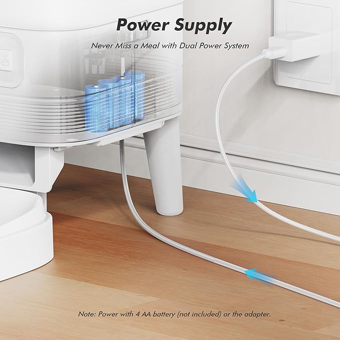 - Dual Power Supply: Powered by either a Type-C adapter or 4 AA batteries (not included), this automatic feeder keeps meals coming even during power outagesβso your pet never goes hungry. It also includes a durable, chew-resistant 1.5-meter nylon cable for flexible and worry-free placement