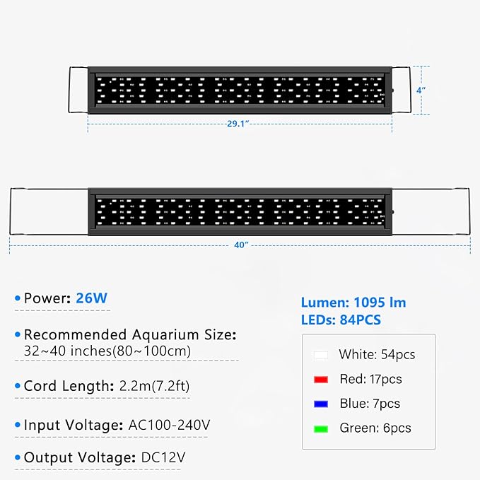 AQQA Full Spectrum Aquarium Light,Fish Tank Lights for Plant Growth Fish Viewing,3 Mode White Blue Red Green LED Beads,Timer,Adjustable Brightness,Extendable Brackets for Freshwater 26W for 32-40inch