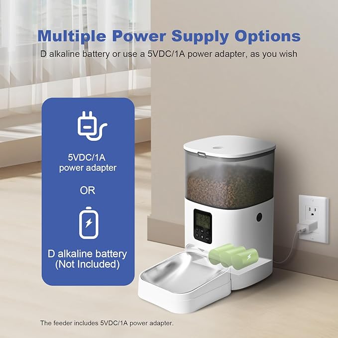 - 【Two power supply options available】- Use the 5V DC adapter while supplying the automatic cat food dispenser via 3 alkaline D-cell batteries(not included) installed in case of power outages, to ensure that your cat gets food consistently.