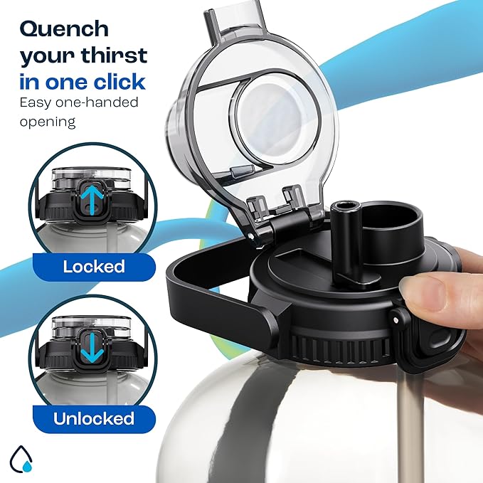 - 1 Gallon Water Bottle with Leakproof Lid - Keep your body hydrated with our 128oz water bottle with straw. The lid is designed with a latch that seals the bottle to prevent any leaks on the go. The ergonomic side grip and wrist strap make it easy to carry around. It's the perfect water jug for all your outdoor escapades.