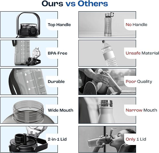 - Half Gallon Water Bottle with Leakproof 2-in1 Lid - Keep your body hydrated with our 64oz water bottle with straw. The lid is designed with a latch that seals the bottle to prevent any leaks on the go. The ergonomic side grip and wrist strap make it easy to carry around. It's the perfect water jug for all your outdoor escapades.