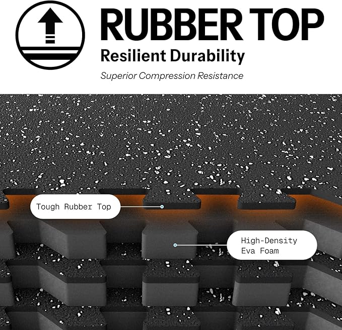 - [Upgraded Dual-Layer Design]: Concerned about your equipment scratching the floor during workouts? Our 2in1 Rubber Top EVA Foam Exercise Gym Mats are crafted to solve this issue. The textured rubber top layer, combined with a high-density EVA foam bottom layer, seamlessly creates a non-slip tough surface with excellent shock absorption.