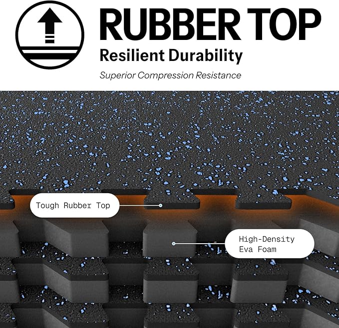 - [Upgraded Dual-Layer Design]: Concerned about your equipment scratching the floor during workouts? Our 2in1 Rubber Top EVA Foam Exercise Gym Mats are crafted to solve this issue. The textured rubber top layer, combined with a high-density EVA foam bottom layer, seamlessly creates a non-slip tough surface with excellent shock absorption.