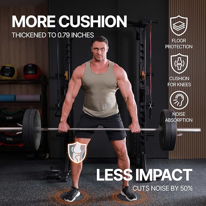 - [Easy to Assemble and Detach]: 12 tiles (24" x 24" x 0.79" each), covers 48 sq ft (8 Γ 6 ft). Upgraded larger interlocking locks provide a secure fit, preventing any separation during use, ensuring you can work out without concerns of shifting. Simple assembly and detachment make it effortless to set up your home gym.