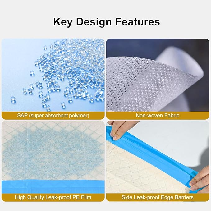 - 【Thick & Durable-Materials】Multiple mixed polymers make it thicker and more absorbent, saving the time you need to replace pads. The back of them does not easily get saturated. The strong waterproof PE membrane reduces liquid from leaking to the floor/carpet. Comfortable and no tracking. Keep your home clean.