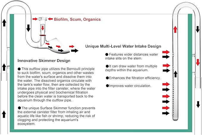 - Minimalist, Safe, Stable: The acrylic surface skimmer is only 1.4 inches (3cm) high, with a simple structure, making it the perfect choice for minimalist aesthetics. This design effectively prevents the external filter canister from sucking in air and fish or shrimp, thereby protecting your filter canister and aquatic life. It also operates more stably, without producing noise.